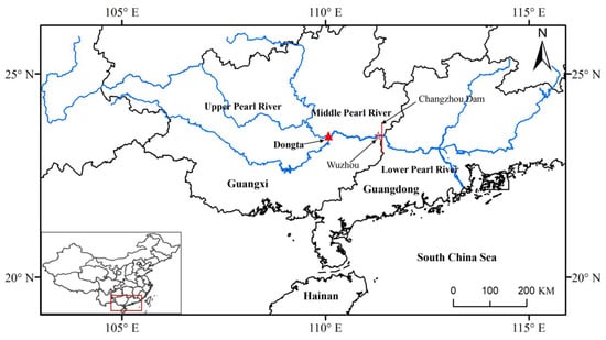 The Pearl River is the second largest drainage in China. This river system is famous for its rich fish diversity and high proportion of endemic species [12,13]. The Dongta river section, located in Guiping City, Guangxi Province, China, is an important spawning ground in the Pearl River due to its especial geographical conditions (Figure 1). Three large river branches meet in the Dongta section, increasing the richness of fish diversity. Notably, the Dongta was once the largest spawning ground for the four common Chinese carp species in the Pearl River [14]. Accordingly, this river section plays a key role in maintaining fish resources in the middle and lower Pearl River. Previous studies of the Dongta section mainly focused on measuring physical and chemical indices and assessing the reproductive hydrological requirement of individual species [14,15]; few reports have investigated which species finish spawning in this section.