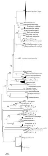The sequences were assembled on the basis of the high-quality tracer files using the Lasergene package (DNASTAR, Inc., Madison, WI, USA). The sequences were aligned using MUSCLE [30] and manually edited in MEGA version 6 [31]. The larval sequences were identified using the Barcode of Life Data System (BOLD [32]) as follows: We focused on the reference sequences of the best and second-best interspecific match in BOLD and documented the corresponding percentages of sequence matches. To represent species boundaries in the BOLD database, we adopted a 1% divergence threshold, as most species in the same region diverge less than 1% [33]. (i) If the unknown sequence was more than 99% similar to the best sequence match and was less than 99% similar to the second-best match, the sequence was unambiguously identified as the best-match species [25,34]. (ii) If the top 100 matches of the unknown sequence were the same species, a neighbor-joining (NJ) tree using the unknown larval sequences and matched sequences was constructed to testify the accuracy. The tree was produced in MEGA 6 with 1000 bootstrap replicates on the basis of the Kimura-2 parameter model [35]. (iii) If the unknown sequence was more than 99% or less than 99% similar to both the best match and the second-best match, and the two matches fell in the same genus, the unknown sequence was identified to genus level only. (iv) If the unknown sequence was more than 99% or less than 99% similar to both the best match and the second-best match, and the two matches fell in different genera, the unknown sequence was identified to subfamily or family level only. (v) If the unknown sequence did not match any reference sequences, these sequences were compared to the GenBank nucleotide database using the Basic Local Alignment Search Tool (BLAST; [36]). Finally, we then used MEGA 6 to build a neighbor-joining tree for identified larvae with 1000 bootstrap replicates based on the Kimura-2 parameter model to verify the accuracy of our identifications.