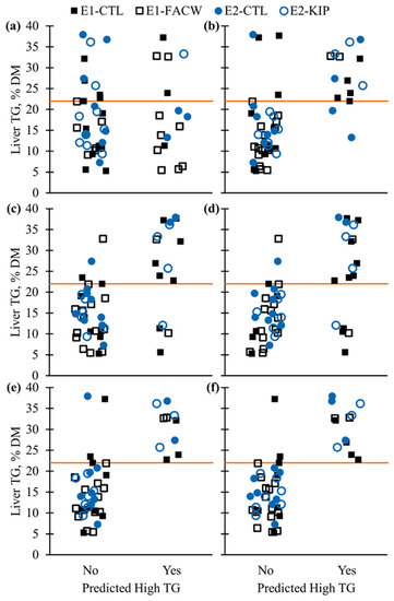 Maximum observed liver tissue triglyceride (TG) content versus High TG status prediction during block cross-validation of sparse partial least squares—discriminate analysis models using blood energy metabolite, protein, and mineral biomarkers. Models used single timepoint (ST, n = 52 cows) or longitudinal blood sampling (LT, n = 47 cows): (a) ST 3 days in milk (DIM), (b) ST 7 DIM, (c) ST 14 DIM, (d) ST 14 DIM without haptoglobin data, (e) LT, and (f) LT without 1 DIM data. Symbols refer to a cow’s original dietary treatment blocks for experiment 1 (control, E1-CTL; fermented ammoniated condensed whey supplementation, E1-FACW) and experiment 2 (control, E2-CTL; ketosis induction protocol, E2-KIP). The orange line represents the observed liver TG % dry matter (DM) threshold for high TG classification (liver TG > 22.0% DM).