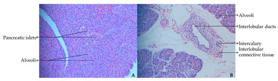 The pancreas of yak calves consists of two parts: the endocrine and exocrine parts, namely the islets and the alveoli (Figure 1A). The exocrine part of the pancreas mainly consists of the alveoli, intercalary ducts, interlobular ducts, and interlobular connective tissue (Figure 1B). The intercalary duct has a small lumen and is connected to the inter-lobular duct at the end. The lumen of the interlobular duct is larger and forms interlobular connective tissue after exiting the interlobular lobules of the pancreas.