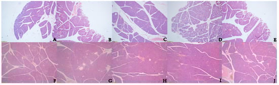 (A–E) Effect of no supplementation of concentrate on morphological development of pancreatic tissue in yak calves under 10× microscope; (F–J) Effect of concentrate supplementation on morphological development of pancreatic tissue in yak calves under 10× microscope.