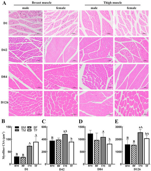 Morphological changes in breast and thigh muscle at D1, D42, D84, and D126 between male and female Wuliangshan Black-bone chickens: (A) HE (hematoxylin–eosin) staining of breast and thigh muscles. Scale bar: 100 μm for D1, D42, D84, and D126; (B–E) comparisons of the CSA of breast and thigh muscle fibers. Different lowercase letters on each bar indicate the same type of muscle; there are significant differences (p < 0.05) between genders. Different capital letters on each bar indicate the same sex; there are significant differences (p < 0.05) between breast and thigh muscles. Abbreviations: CSA, cross-sectional area; D, postnatal days; BM, breast muscle of male; BF, breast muscle of female; TM, thigh muscle of male; TM, thigh muscle of male.