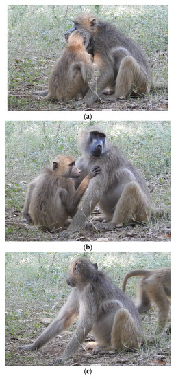 In Baehren’s review [1], the level of study is discussed as being an area of particular confusion across studies of leave taking. In the daily following of free-ranging wild populations, it is often not possible to see great numbers of long-term separations, e.g., group departure, transfer, etc. These events are relatively infrequent and would not yield high amounts of data to investigate the associated behaviours. However, in cohesive groups, it should be possible to look at the endings of daily interactions that happen frequently between individuals of the same social group. Although these interactions may not have the “finality” of longer separations, the frequency of their occurrence and their potential function in the ongoing social relationships within the group might mean that they are in fact particularly important for our understanding of leave taking. In this study, we looked at the low-level leave takings, endings of social interactions within a cohesive group of chacma baboons (Figure 1a–c). This allowed the practical benefit of an increased sample size of separation events, but also the detailed investigation of these “every day” social separations from dyad interactions.