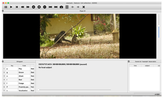 Open access event-logging software, BORIS, was used to collect behavioural data from digitally imported videos [34] (Figure 2). This gave the advantage of rewinding from separation to record prior behaviour, something that is almost impossible to collect in real time. The unit of measurement for this study was “observations”, which was defined as being from the start of an activity (solo or joint) to the moment where the departure (solo or joint) occurs. Dyads were chosen opportunistically and exhaustively throughout the video footage, and the parting individual was defined as the first to leave the dyad (or the only individual in the case of solo activity). For each observation, the unique video ID was recorded and the observations numbered.