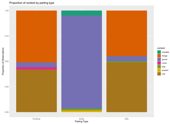 The context of observations was limited; the majority included contexts of rest, foraging, and grooming. However, as context correlated so strongly with parting type (see Figure 3), only parting type was used in the present analysis, due to the focus on the social driver of leave taking.