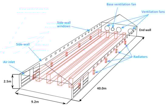 The modeled poultry house was an experimentally oriented manure-belt layer house located in Chengdu, Sichuan Province, China (30.47 N, 103.73 E). The dimensions of this east–west oriented house were length, , width, height, and (see Figure 1). Three tunnel ventilation fans, each with a diameter of (,), and a small base ventilation fan with a diameter of (,) were installed at the end wall of the house for tunnel ventilation and base ventilation, respectively. Base ventilation was mainly employed to maintain temperature and relative humidity, and prevent the accumulation of harmful gases in winter. Tunnel ventilation is applied to control the indoor climate year round. Moreover, evaporative cooling pads (corrugated materials, in total ) were installed at the air inlets located at the other side of the house, which were activated in hot weather and cooled the outdoor air that passed through by adiabatic saturation. With regard to indoor heating, 10 forced-fan radiators were used to carry out the heating task, as shown in Figure 1. The small fan installed at the back of each radiator was turned on to enable forced convection heat transfer between radiators and airflows when the indoor temperature dropped below the critical temperature and a heating load was needed. Furthermore, although the poultry house was equipped with 32 sidewall windows, they were not utilized in this study and kept closed during the validation test. In the house, there were 4 rows of animal-occupied zones, and each row had 3 tiers of cages raising up to 15,000 chicks of a local species (Dahen 699). The materials and thermal-physical characteristics of the house are provided in Table 1. Furthermore, the internal heat capacity of the poultry house was determined to be , and default values were used for other parameters according to ISO 13790 [26].