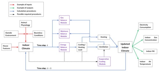 The customized model developed in this study was based on the simple hourly method described in ISO 13790 [26]. The input data included the hourly outside environmental data (e.g., air temperature, air moisture, solar radiation intensity), building geometrical properties, thermal characteristics of the building, animal physiology (e.g., age, weight, heat production) and boundary conditions (e.g., set indoor temperature), which were determined from local management requirements, depending on the reared animal and expressed as a function of the animal age. For each time step of one hour, provided that the required boundary conditions, heat gain/loss and thermal behavior of the house envelope were known, the energy balance could be solved given the required heating or cooling load for indoor climate control. Moreover, at each time step, the moisture balance and gas balance (ammonia and carbon dioxide) were also simultaneously solved as long as the ventilation rate was determined. The indoor climate was updated at the end of the time step, and electricity consumption due to climate control was calculated considering the efficiency. A flow chart is provided in Figure 2 to show the overall simulation procedures with the examples of inputs and outputs at time step . Detailed descriptions for each module and essential parts of the customized model are provided in the following sections.