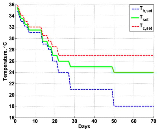 Indoor climate control aims to provide reared animals with optimum environmental conditions to maximize performance. However, the required conditions are different at different stages of rearing. In this study, the indoor set temperature, , varied as a function of bird age, and a relatively higher temperature was required for the chicks at the beginning of the batch, while a relatively lower temperature was required when the birds grew up. A deadband in temperature was set wherein the temperature could fluctuate in free-running conditions. The lower value of the band was defined as the heating set temperature, , and upper value of the band was treated as the cooling set temperature, . Based on the local management experience for the local species, the indoor set temperature, , for optimum bird performance is illustrated in Figure 3 together with the and from 1 week of age to 10 weeks of age (70 days). As shown in Figure 3, at the beginning of the batch, the indoor temperature was set at approximately 35.5 °C, as the chicks are vulnerable to cold air. From week 8, the indoor temperature was lowered to approximately 24 °C, and this value was applied for the remaining time.
