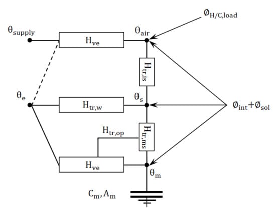 As demonstrated in Figure 4, the heating or cooling load is applied on the indoor air temperature node and represented as . The thermal losses by ventilation are calculated by the temperature difference between the supply air and indoor air and as a function of the network resistance, , which indicates the heat transfer coefficient by ventilation (it should be noted that the external air temperature, , is equal to the supply air temperature, , when evaporative cooling is not activated). Each node shown in Figure 4 represents a considered temperature, and the corresponding resistances, , of the network indicate the heat transfer coefficients. Since the full set of equations for the simple hourly method was provided in ISO 13790 Annex C [26] and all aspects considered in the model or parameters shown in Figure 4 were described thoroughly in ISO 13790, readers should refer to ISO 13790 for detailed information.