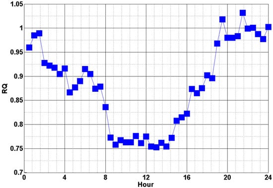 where is the concentration at the inlet, which was experimentally measured (model input data), ppm. The value of varies theoretically from to depending on the metabolic rate, feed intake and individual status of the animal [31]. In this study, the applied value during a day ( h) was based on the study performed by Xin et al. [32], as shown in Figure 6. Higher values were measured at night than during the daytime, which is probably associated with the greater energy retention and thus tissue deposition during this period [32].