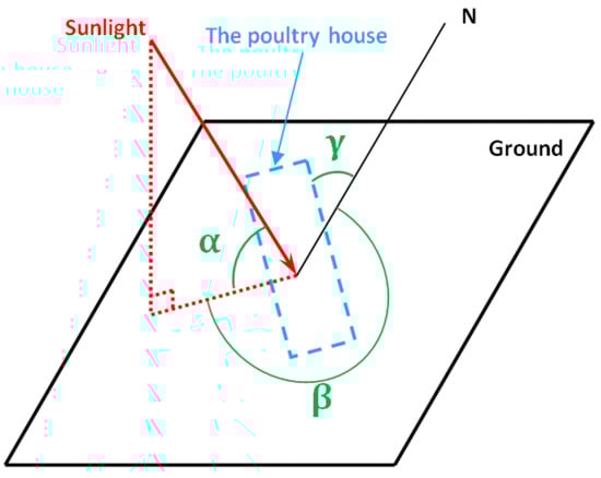 where is the effective collecting area of the building, , which is linearly related to the projected area of the building wall () perpendicular to the sunlight and other physical parameters of the wall material, as detailed in ISO 13790 [26]. is the solar irradiance, which was experimentally measured in this study during the whole batch period, . is the shading reduction factor, and is the heat flow due to the thermal radiation to the sky from the building, which is clearly explained in ISO 13790 ([26] Section 11.3.2) and will not be detailed here. Since , or more specifically , varies with the solar trajectory, it was important to take the position of the sun and dynamic value of into consideration when modeling the energy consumption of the poultry house for a relatively long time.