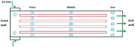 Schematic drawing of the locations of the sensors inside the analyzed poultry house. No. 1~No. 17 indicate the locations of the sensors.