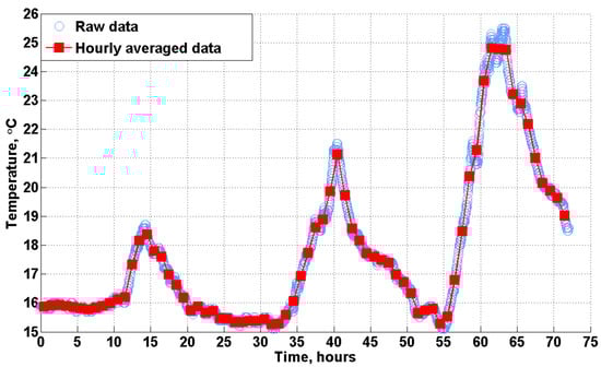 To provide a clear and direct comparison with those data predicted by the customized hourly model, the raw data measured and recorded every minute by the sensors were also averaged every hour, as shown in the example in Figure 9. This format of hourly averaged data is applied in the results.