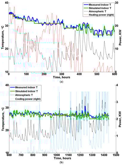 The goodness-of-fit of the model for temperature (T) and relative humidity (RH) was statistically evaluated by using the root mean square error (RMSE) and mean absolute error (MAE), as shown in Table 9. The RMSEs of the hourly T and RH were and , respectively. The MAE was calculated to be for the hourly indoor temperature and for RH. The above statistical indices were considered to be satisfactory according to Costantino et al. [24]. Furthermore, with regard to the averaged daily values, all errors were lower than the hourly values, indicating a better fit.