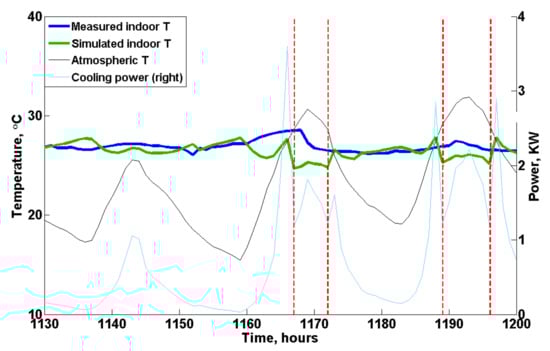 An example of the effect of evaporative cooling on the indoor temperature is shown in Figure 11. A sudden decrease in the indoor temperature was simulated by the model at 1167 h (indicated by the red dashed line in Figure 11), while the atmospheric temperature kept rising in the following hours, which indicated that the supply air temperature in the poultry house decreased significantly resulting from the activation of evaporative cooling. Furthermore, the temperature measured by the sensors also indicated that evaporative cooling was activated in the poultry house in reality but approximately 1 h later at 1168 h, as shown in Figure 11. Moreover, when evaporative cooling was activated, the cooling power of the tunnel ventilation predicted by the model (blue line in Figure 11) also decreased since the required amount of cool fresh air to control the indoor temperature was reduced. Furthermore, the model prediction indicated that evaporative cooling wss activated again the next day at approximately 1189 h, but it was not recorded by the sensors. One possible reason is that due to the high relative humidity in Chengdu city, the cooling pads, which were wetted at 1168 h, were still effective at 1189 h, providing low temperature air to the poultry house.