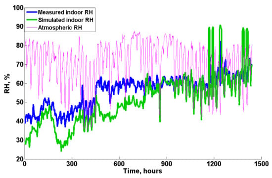 - The simulated indoor temperature and relative humidity matched well with the monitored data showing similar overall trends. The average RMSEs of the daily T and RH were and , respectively, indicating acceptable discrepancies according to a previous study [23].
