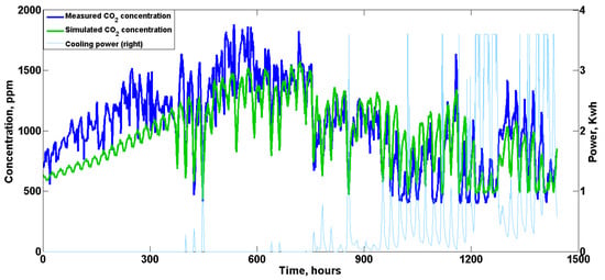 In this study, the base ventilation fan was activated all the time during the validation test and in the model, resulting in a constant ventilation rate of and a constant power requirement.
