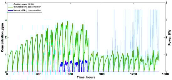 Simulated indoor NH3 concentration during the validation test. Note: The base ventilation is not included in the figure. The maximum rated tunnel ventilation power was .