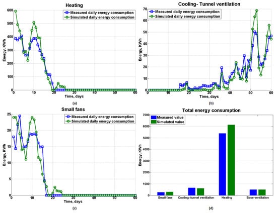 The overall energy consumption due to the environmental control in the poultry house for different aspects is illustrated in Figure 15. As shown in Figure 15a, the predicted daily heating energy matched well with the measured data except during the first few days. The discrepancies noted at the start of the batch are probably due to the underestimation of the animal heating production based on Equation (1), which might to some extent be responsible for the higher heating requirement in the model. Regarding tunnel ventilation and small fans, as shown in Figure 15b,c, the estimated energy consumption showed good agreement with the monitored value both in terms of the overall trend and absolute value. Finally, the total energy consumption for the 60-day validation test is shown in the bar chart in Figure 15d. The corresponding differences between the measured and simulated energy consumption for heating, tunnel ventilation, base ventilation and small fans were , , and , respectively. Since the base ventilation was kept activated at the rated power at all times both in reality and in the model, almost no difference was found. The majority of the energy was consumed by heating in reality, accounting for approximately , followed by tunnel ventilation () and base ventilation (). In summary, the total energy consumption predicted by the model was , while the measured value was 6824.2 kWh, demonstrating a difference of approximately , which is acceptable considering that various human factors were not considered in the theoretical model. Finally, since the solar irradiance in Chengdu city is very limited, with a recorded daily maximum value of approximately during the validation test, taking the solar radiation into consideration would only have had a impact on the total energy demand in the present study.
