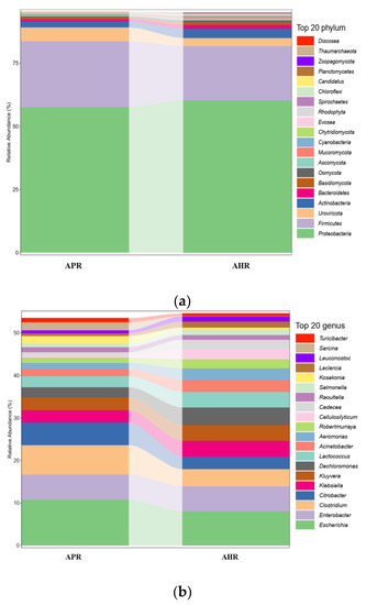 It can be seen from the results in Figure 1b that these 20 microorganisms account for about 50% of the total number of communities. From the results in Figure 1b, it can be seen that the relative abundances of Escherichia, Citrobacter, and Enterobacter under Proteobacteria and Clostridium under Firmicutes in the AHR group are lower than that of the APR group, while the relative abundance of Klebsiella, Kluyvera, Acinetobacter, and Dechloromonas under Proteobacteria and Lactococcus under Firmicutes were higher than that of the APR group.