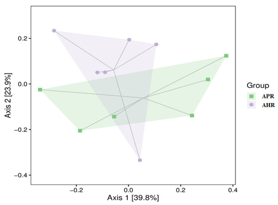 Figure 2 is a PcoA cluster analysis diagram of gut microbial β diversity in captive giant pandas adopted with different nursing methods. As can be seen from Figure 2, the gut microbial communities of the captive giant pandas in the APR group and AHR group are similar. It can be seen from Table 3 and Table 4 that there is no significant difference in the β-diversity index (Adonis and ANOSIM) of the captive giant pandas’ gut microbes among the groups (p > 0.05).