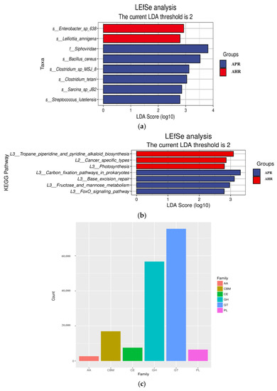 The functional abundance tables of the KEGG and CAZy databases are analyzed by LefSe, respectively. Comparing the effects of different parenting methods on the functional groups of adult giant pandas’ gut microbes, it indicates that there are four types are significantly enriched in the APR group, such as carbon_fixation_pathways_in_prokaryotes; the AHR group has three types are significantly enriched, such as tropane_piperidine_and_pyridine_alkaloid_biosynthesis (Figure 3b). In addition, the CAZy enzyme functional module annotation results show that the largest number of protein families were annotated to the corresponding glycoside hydrolases (GHs) and glycosyltransferases (GTs), which are 56,674 and 75,376, respectively (Figure 3c).