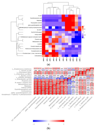 The relative abundances of 7 bacterial groups with significant differences at the species level obtained by metagenomic sequencing analysis in all experimental samples and the expression levels of 32 significantly different metabolites obtained by metabolomics analysis were arranged in a table. The Spearman analysis method was used to calculate the correlation coefficient between the significantly different microbiota and the significantly different metabolites in the experimental sample and draw the correlation matrix heat map.
