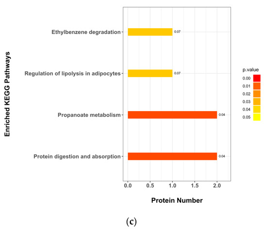 Hierarchical clustering of each group of samples is performed using the expression of metabolites with qualitatively significant differences. The results show that the fecal metabolic characteristics of adult captive giant pandas changed significantly due to the parenting method, and the changing trends of these metabolites are described by a heat map (Figure 4a); metabolite correlation analysis show that these metabolites interacted (Figure 4b), including a positive correlation between propionic acid and methylmalonic acid. Correlation analysis is performed between the screened microorganisms with differential levels and differential metabolites. The results show that s_Clostridium_tetani and s_Clostridium_sp_(MSJ_8) are significantly positive correlated with propionic acid (r = 0.46, p < 0.05; r = 0.61, p < 0.01) and methylmalonic acid (r = 0.38 p < 0.05; r = 0.39, p < 0.05) related to propionic acid metabolism; s_Lelliottia_amnigena is significantly negatively correlated with N-acetyl-l-aspartic acid (r = −0.52, p < 0.05); and s_Enterobacter_sp_638 is significantly negatively correlated with corticosterone (r = −0.46, p < 0.05)(Figure 4b). It can be seen from the KEGG pathway analysis results that there are four major metabolic pathways with significant differences, namely: protein digestion and absorption, propionate metabolism, regulation of lipolysis in adipocytes, and ethylbenzene degradation (Figure 4c).