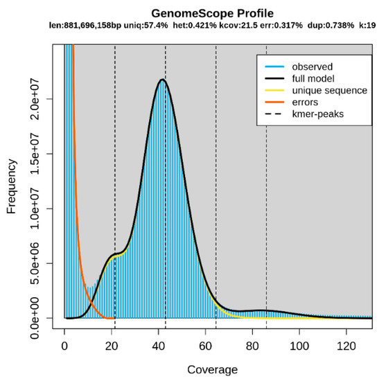 Genome sequencing data (Table 1) were used to predict the genome size via K-mer analysis. K-values of 17, 19, and 25 were used, and the 19-mer was best estimated. Based on the 19-mer distribution, the estimated genome size was 881.7 Mb in total, and the unique sequence, heterozygosity, error, and duplication rates were 57.4%, 0.421%, 0.317%, and 0.738%, respectively (Figure 1). Other estimated K-values used and the genome size, heterozygosity, error, and duplication rates are displayed in Supplementary Table S1.