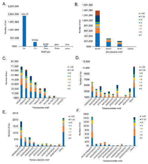 The assembled genome was used to identify microsatellites using QDD version 3.1.2. A total of 2,252,265 microsatellite motifs were identified. Among these, dinucleotide repeats (1,920,127; 85.25%) had the highest rate, followed by trinucleotide repeats (275,584; 12.24%), tetranucleotide repeats (46,099; 2.05%), pentanucleotide repeats (6676; 0.30%), and hexanucleotide repeats (3799; 0.16%; Figure 2). The most frequent motif in dinucleotides was AC/GT (72.23%), followed by AG/CT (16.41%), AT/AT (11.30%), and CG/CG (0.06%). The most frequent motifs in the trinucleotide repeats were AAT/ATT (25.32%), followed by AGG/CCT (22.85%), AAC/GTT (17.76%), AGC/GCT (12.72%), AAG/CTT (8.06%), ATC/GAT (8.17%), AAC/GGT (2.09%), ACT/AGT (2.03%), CCG/CGG (0.53%), and ACG/CGT (0.47%). Among tetranucleotide, pentanucleotide, and hexanucleotide repeats, the most frequent motifs were AGGG/CCCT (13.50%), AGAGG/CCTCT (28.30%), and AACCCT/AGGGTT (39.01%). These results confirm that the high mutation rate is closely related to long mutations, which is consistent with the observation that the repeat frequency decreases with repeat length [22].