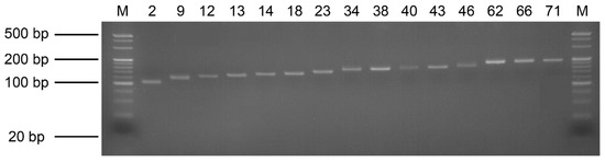 Using the default parameters of the QDD pipeline and the conditions set forth in [20], we identified 84 primer pairs in the C. dewitti draft genome. Thirty primer pairs were randomly selected for verification and used for PCR. As a result, 15 primer pairs were confirmed to yield only a single band, and the primer sizes are shown (Figure 3 and Table 3).