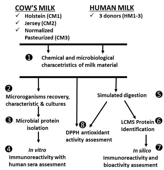 A schematic presentation of the experimental design is shown in Figure 1. Initial milk samples were submitted for chemical and microbiological analyses. Microorganisms were isolated from the initial material (point 1), which were then subjected to tests for the characteristics of viability, culture, and isolation of MP (point 2). MP immunoreactivity was analyzed with human sera (point 3). The milk types were submitted to simulated gastrointestinal digestion (point 4) and protein identification (point 5) followed by in silico activities analyses (point 6). Both raw and digested materials were submitted to antioxidant activity assessment (point 7).