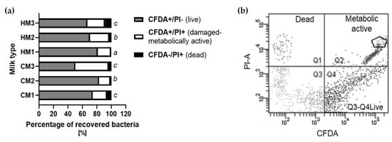 Although not all microbes are culturable and some cannot grow after recovery from dairy material, that does not mean they are dead. This is indicated by the results of the microscopic counting of the cells and the analysis of the metabolic activity of the bacteria presented in Figure 2. At the same time, the metabolic activity was tested since even unculturable microorganisms are a source of MP. An example of this phenomenon is CM3 after the pasteurization process. For CM1, an amount of 6.1 log cells/mL was determined and for CM2 it was 5.7 log cells/mL, while for CM3 an amount of 3.8 log cell/mL was determined. Although the ratio of microorganisms capable of growth (Table 2) meets the recommended microbiological norms, the ratio of metabolically active but damaged cells remained high (CFDA+/PI+ = 46%). For all other types of raw materials, the average rate of CFDA+/PI+ was about 25%. In the raw cow’s milk samples (CM1 and CM2), this coefficiency was lower than in the human samples and it did not exceed 20%. The low dead cell ratio (CFDA−/PI+ = 3.5%) in the sample isolated from the material after pasteurization may result from the fact that the milk has been normalized in terms of fat, which is also associated with the process of the centrifugation of the sample during which the dead cells may have been eliminated with the fat. This phenomenon can also be related to the thermal processing of the milk, which deactivates cells but does not kill them.