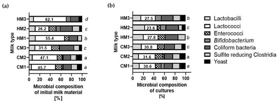 The composition of initial milk material isolated microorganisms (a) and microbial cultures (b). Different letters denote significant difference with respect to Duncan test, and p < 0.05 values for the proportion of microorganisms represent the compositions from different materials.