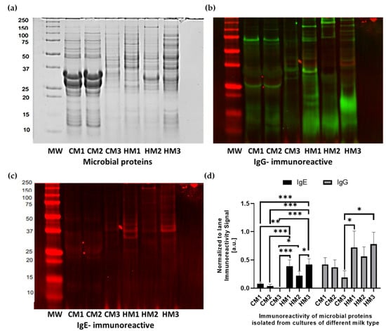 The in vitro determination of bacterial proteins’ immunoreactivity tested with human allergic serum. (a) SDS PAGE separation of bacterial proteins’ isolates; (b) IgG-immunoreactivity with IRDye® 800 CW; (c) IgE-immunoreactivity with IRDye® 680 RD; (d) Signal of immunoreactive bands normalized for each lane by deriving the ratio of the signals of the total protein in each lane. MW—molecular weight marker; CM1-CM3—proteins of bacteria isolated from cultures based on cows’ milk microbial isolates; HM1-HM3—proteins of bacteria isolated from cultures based on human milk microbial isolates. Asterisks denote significant difference with respect to the Duncan test values of immunoreactivity for the proteins isolated from microorganisms from different milk types.