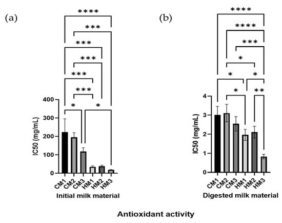 The antioxidant capacities of dairy materials and their digests. Presented as IC50 antioxidant activity for the different initial milk materials (a) and for different digests (b). Asterisks denote values significant difference with respect to Duncan test at * p < 0.05, ** p < 0.01, *** p < 0.001, or **** p < 0.0001.