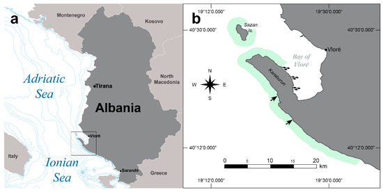 The coast of Albania is characterized by low coastal formations along the central and northern part of its sea borders (Southern Adriatic Sea) and erosive coastline from Vlorë to Sarandë (Northern Ionian Sea) along the southern parts of the country. The southern coast is predominantly categorized by cliff coasts (from Karaburun-Sazan to Sarandë) interrupted in some sectors by pebble and sandy beaches. It lowers down towards Butrinti Bay, close to the southern border, into an accumulative coastline. The Peninsula of Karaburun and the island of Sazan are the areas where marine caves are mostly concentrated [16,17,18]. The territory was established as a protected area in 2010, including the correspondent aquatic territory (Marine National Park “Karaburun-Sazan”, hereafter MNP K-S).
