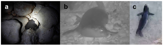(a) Mediterranean scat collected in cave 1; (b) picture of the monk seal specimen caught on infrared camera in cave 1; (c) picture extracted from a video of monk seal collected in 2019 by RAPA Vlorë within the cited citizen science project.