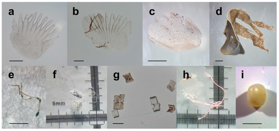Items identified in Mediterranean monk seal recovered in Albania: (a) sea bass scale, (b) (possible) sea bream scale, (c) garfish scale, (d) Posidonia, (e) piece of nylon net, (f) lump of fibres (cellulose), (g) pieces from unknown origin (possibly pieces of fish spines), (h) pink fibre (polymer identification not carried out), and (i) pearl (scale bar: 1 mm).