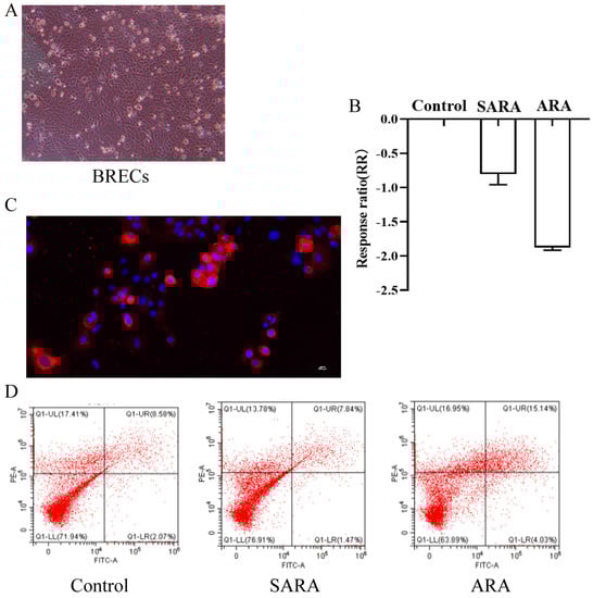 The effects of pH treatments on the viability of BRECs in vitro are shown in Figure 1C. The results showed that the different pH treatments significantly reduced the viability of BRECs (p < 0.01). The BREC apoptotic rates were estimated by flow cytometry (FCM) and fluorescence microscopy (Figure 1D). Compared with the SARA group, the ARA group had a significantly reduced proportion of normal cells (p < 0.05). The pH treatment did not affect the proportions of necrotic cells and early apoptotic cells (p > 0.05). Compared with the control and SARA groups, the ARA group had a significantly increased proportion of late apoptotic cells and scores on the apoptosis index (p < 0.05) (Table 1).