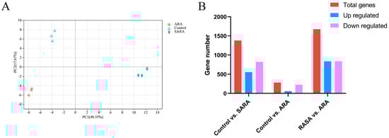 PCA of gene expressions and numbers of DEGs in the BRECs. (A). PCA of gene expressions in the three groups of BRECs. (B). Graphical representation of significant DEGs detected “control vs. SARA”, “control vs. ARA”, and “SARA vs. ARA” in BRECs cultured at different intensities at different pH values.