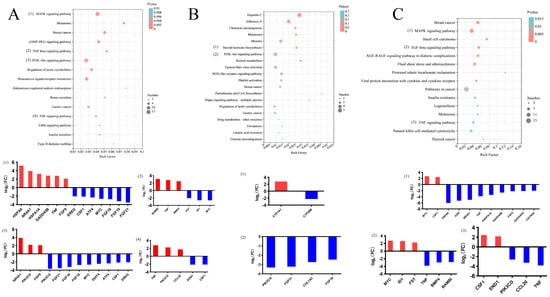 The results of KEGG pathway analysis showed that 18 pathways (p < 0.05) (Supplementary Materials Table S6), mainly related to PI3K-Akt signaling pathways (e.g., PIK3CG, ATF4, FGF19, PCK2, VEGFA, LPAR1, DDIT4, FGF21, and IL7R), and MAPK signaling pathways (e.g., ATF4, FGF19, VEGFA, RASGRP1, and FGF21), were significantly enriched; the top ten KEGG pathways are shown in Figure 4.