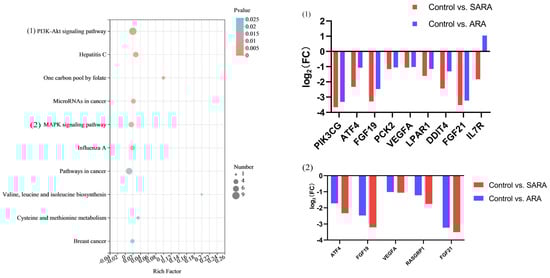 A total of 1381 and 283 significantly ([log2 (FC)] > 1, p < 0.05) DEGs were documented in the two comparisons of “control vs. SARA” and “control vs. ARA”, respectively. Of these DEGs, 94 genes were commonly shared among the three comparisons. A total of 20 BP and 3 MF terms were significantly enriched (p < 0.05), and most were major molecular functions, e.g., immune effector processes, defense responses, regulation of transport, regulation of cell communication, response to organic cyclic compounds, and response to stress. Seven downregulated DEGs (e.g., PIK3CG, ATF4, PCK2, FIBIN, NRIP1, SLC7A11, IFIT1, DDIT4, and TMF1) and one upregulated DEG (e.g., CYP1A1) were enriched in BP and are associated with the response to organic cyclic compounds. The three major molecular functions related to DEGs consisted of receptor-ligand activity, signaling receptor activator activity, and receptor regulator activity. A complete set of GO terms and DEGs involved are provided (Supplementary Materials Table S6).