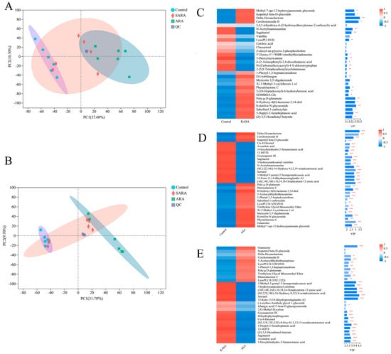 Principal component analysis (PCA) score plots of metabolomic data (A,B) and variable importance of the projection (VIP) scores of spermatozoa metabolites (C–E). (A) Positive ionization modes. (B) Negative ionization modes. Green = control group; blue = SARA; yellow = ARA; orange = QC; QC = quality control samples. (C) Control vs. SARA. (D) Control vs. ARA. (E) SARA vs. ARA. Each column represents one sample and the sample names are shown below each column. Each line represents one metabolite, and the colors represent the relative expression amounts of the metabolites in the group of samples. See the gradient color block for the corresponding relationship between the color gradient and value size. A metabolite VIP bar chart is shown on the right. Bar lengths indicate the contribution values of the metabolites to the difference between the two groups. By default, VIP > 1. The greater the value is, the greater the difference between the two groups. The bar color intensity denotes the statistical significance of the difference in metabolites between the two groups. * stands for p < 0.05, ** stands for p < 0.01, and *** stands for p < 0.001.