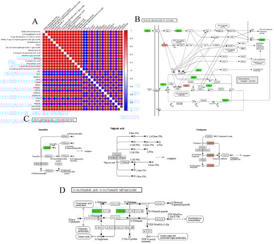 In control vs. SARA, comparing the transcriptomic and metabolomic data showed that highly positive correlations were obtained for most of the differential metabolites. ID1, MYC, ATF4, NRG1, DDIT4, IRX3, and RAB7B were negatively correlated with differential metabolites. There were also high correlations among DEGs (Figure 6A). Maps of all DEGs and differential metabolites into KEGG that were significant enrichment pathways between control vs. SARA, including D-Glutamine and D-glutamate metabolism, Choline metabolism in cancer and Drug metabolism-cytochrome P450, are shown in Figure 6B–D.