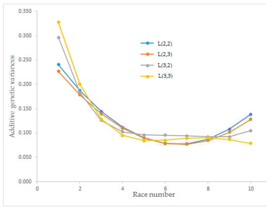 The estimated phenotypic variances for race speed from different order Legendre polynomial models showed similar curve shapes. All Legendre polynomial models had a decreasing trend until race number seven. After race number eight, model L(2,2) showed an increasing trend while the others continued to decrease. Owaga and Satoh [] found a polynomial graph for phenotypic variances that did not fit our results (Figure 3). The shape of the estimated phenotypic variances and estimated additive genetic variances were similar. Still, the shape of the estimated permanent environmental variances was different, especially for L(2,3) and L(3,3), which could significantly affect heritability estimates. The findings of Abacı [], and Owaga and Satoh [] on the shape of graphs differed from our findings, which the data structure could explain. Further, the shape of the estimated phenotypic variances and additive genetic variances found by Buxadera et al. [] differed from our findings.