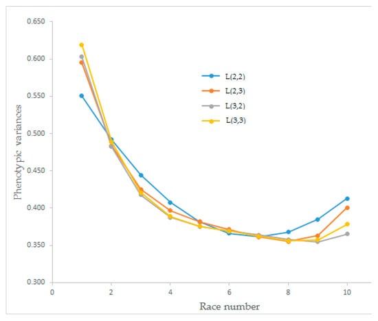 Estimates of the phenotypic variances of race speed for the four Legendre polynomial models have changed between 0.355 and 0.619, and the trends are presented in Figure 3. The phenotypic variances for all four Legendre polynomial models had a decreasing trend. The model obtained from L(2,2) decreased until the seventh race, and the others decreased until race number eight, then all tended to increase.