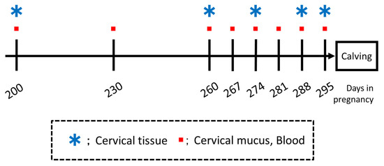 Blood and cervical mucus samples were collected from cows on days 200, 230, 260, and every 7 days after day 260 (all ±3 days), and cervical tissue samples were collected on gestation days 200, 260, 274, and 288 (all ±3 days) of pregnancy, and repeated every 7 days thereafter until calving (Figure 1).