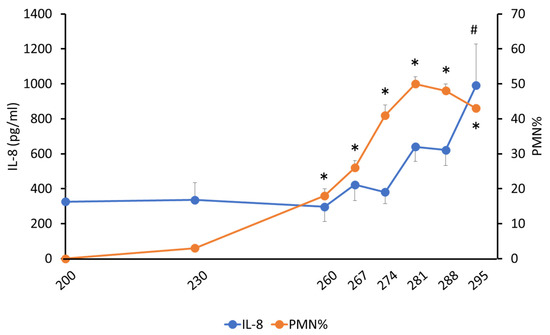 Interleukin-8 and polymorphonuclear neutrophil % in bovine cervical mucus with days of pregnancy. # p < 0.05 compared with 200 days in IL-8; * p < 0.05 compared with 200 days in PMN%.