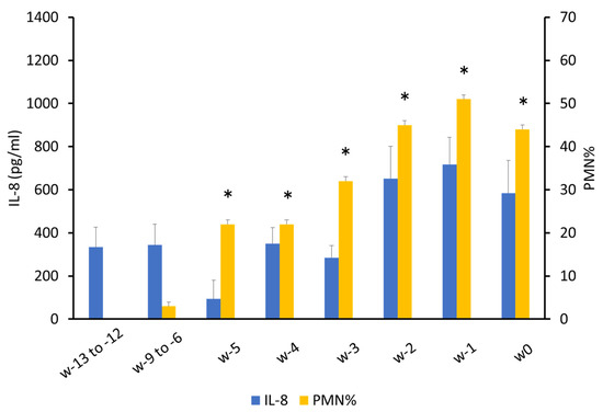 Interleukin-8 and polymorphonuclear neutrophil % in bovine cervical mucus with weeks to calving. * p < 0.05 compared with w-13 to -12 in PMN%.